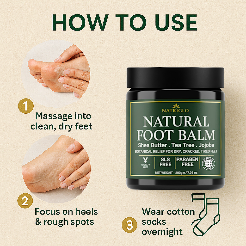 For daily maintenance: Apply a thin layer to clean, dry feet each morning, focusing on heels and any areas prone to cracking. The balm will absorb within 15-20 minutes, leaving a protective, non-greasy barrier. For best results, pair with our Gentle Foot Exfoliating Scrub 2-3 times weekly to remove dead skin before balm application.