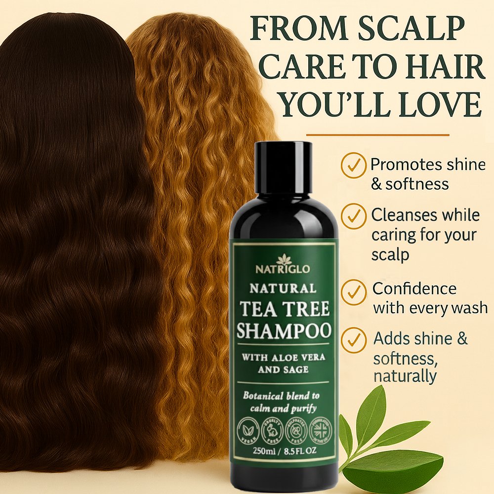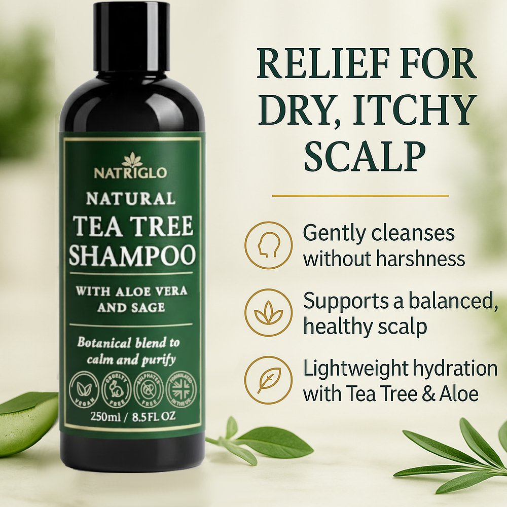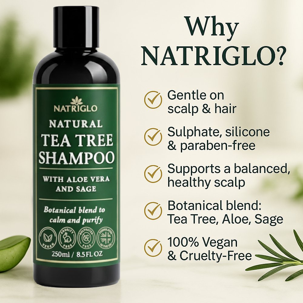 A UK-made, plant-based shampoo for sensitive scalps. Experience gentle relief with our UK-made organic shampoo for sensitive scalp. Formulated with organic tea tree oil, aloe vera, and sage to calm irritation, soothe itching, and purify without harsh sulfates or chemicals. The perfect daily solution for delicate, reactive scalps.